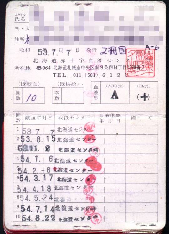 なお、北海道赤十字血液センターの現在の所在地はこの献血手帳に印刷されている場所ではありません。 移転に伴い、電話番号も変更になっていますのでお間違いのないようにお願いいたします。(写真提供: 某Sさん)